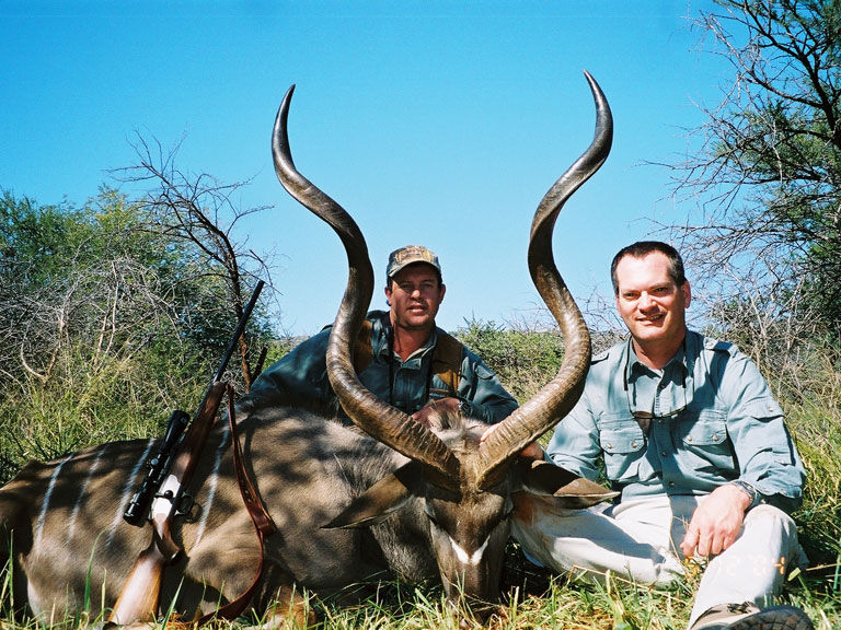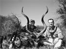 BlaserPro.com owner, Captain Dave Funk (right) with PH Schalk van Heerden of Bush Africa Safaris, RSA with a 54" Kudu bull in May, 2004. Rifle is a Blaser R93LX in .338 Winchester Magnum, shooting 225gr. Federal Premium, Trophy Bonded Bear Claw bullets and wearing a Trijicon Accupoint 3-9x40mm scope. You can find links to Schalk's web site elsewhere on BlaserPro.com.