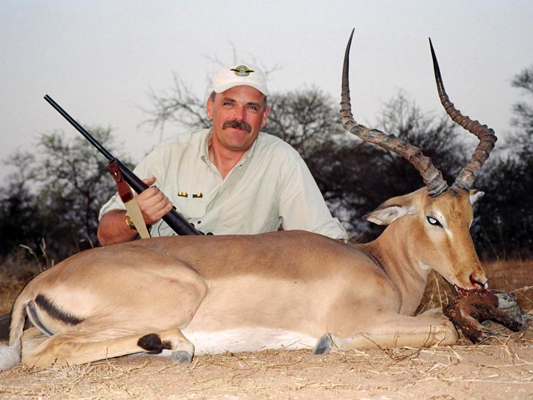 Capt. Mike Trenholm, Chief Pilot, Minnesota Department of Natural Resources, with the new #6 RSA Impala. Mike used his Blaser R93 Offroad in 6.5x55mm shooting Lapua Mega 155gr. bullets on this Impala and a Warthog. His wife, Carol, also took a 25"+ Impala with this gun. Mike shoots left handed and Carol shoots right, they swap bolts in the field to utilize the same rifle.
