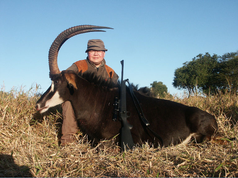 This trophy Sable was taken by Eric Ching with his R93 Blaser Synthetic with 9.3x62 barrel, 286-grain Nosler Partitions at 2335 fps, and fitted with a Leupold 1.5-5X Vari-X III set at 3X in a Blaser QD mount. Eric, was a contributor to this web site, was also the inventor of the Ching Sling and Safari Ching Sling, a noted author, and Scout Rifle authority. Unfortunately, we lost Eric on July 28, 2007, after a courageous fight with cancer. He was a great shooter, writer and as his wife Rita said, a man who lived his life with great dignity and faced death the same way. I feel blessed to have had the chance to call him my friend.